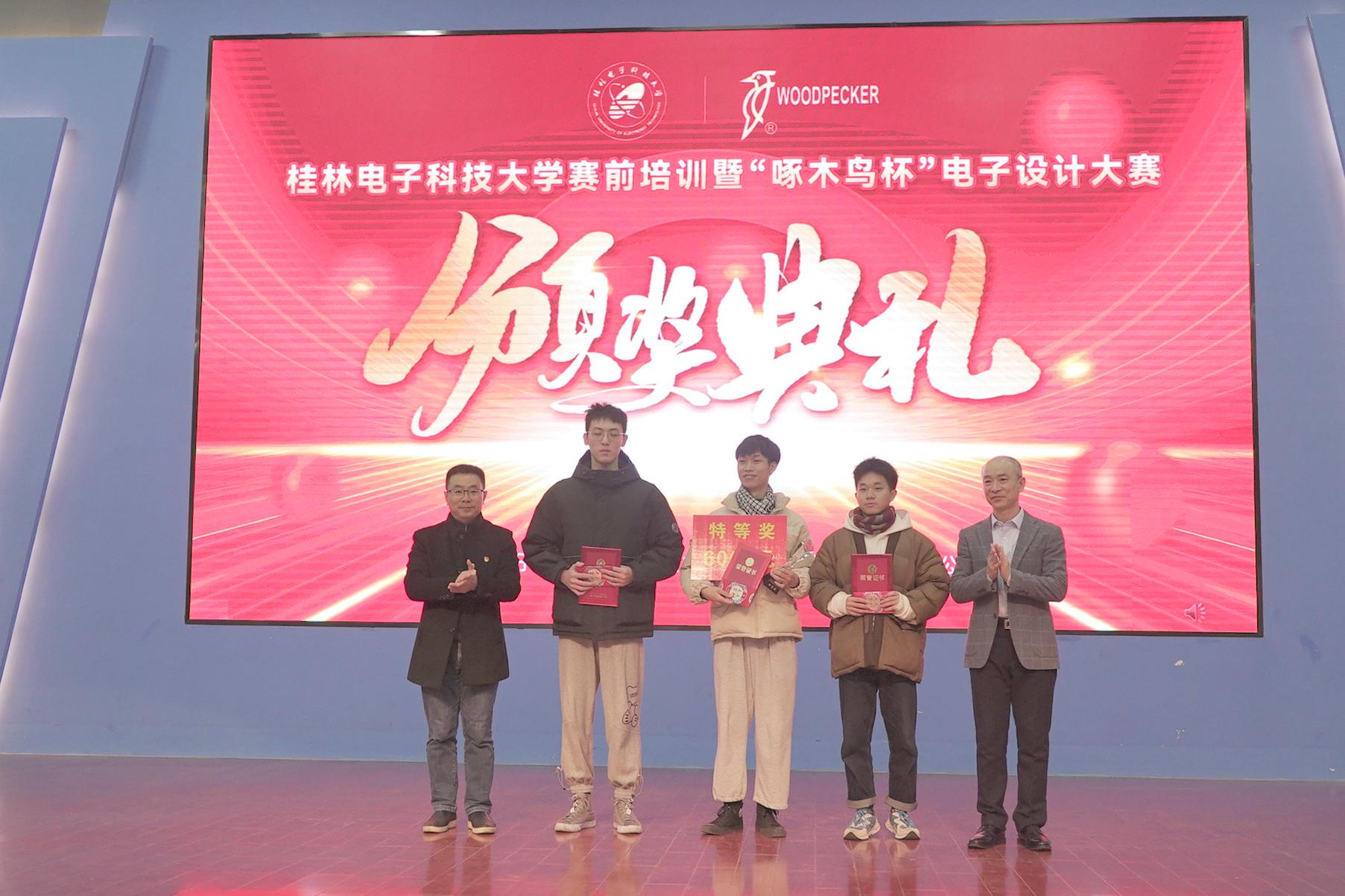 12月29日,三亿官方官网三亿(中国)_三亿(中国)与桂林市啄木鸟医疗器械有限公司联合主办的 “啄木鸟杯”电子设计竞赛颁奖典礼在花江校区大学生活动中心演艺厅举行。副校长潘开林,三亿官方官网三亿(中国)_三亿(中国)桂林校友会会长、桂林市啄木鸟医疗器械有限公司董事长吴勋贤,桂林市啄木鸟医疗器械有限公司副总经理林剑华、研发中心副总监韦锋文,三亿官方官网三亿(中国)_三亿(中国)教务处、校团委、信息与通信学院相关负责人出席颁奖会,与会领导和嘉宾分别为获奖学生颁发了证书和奖金。颁奖典礼由教务处副处长赵中华主持。