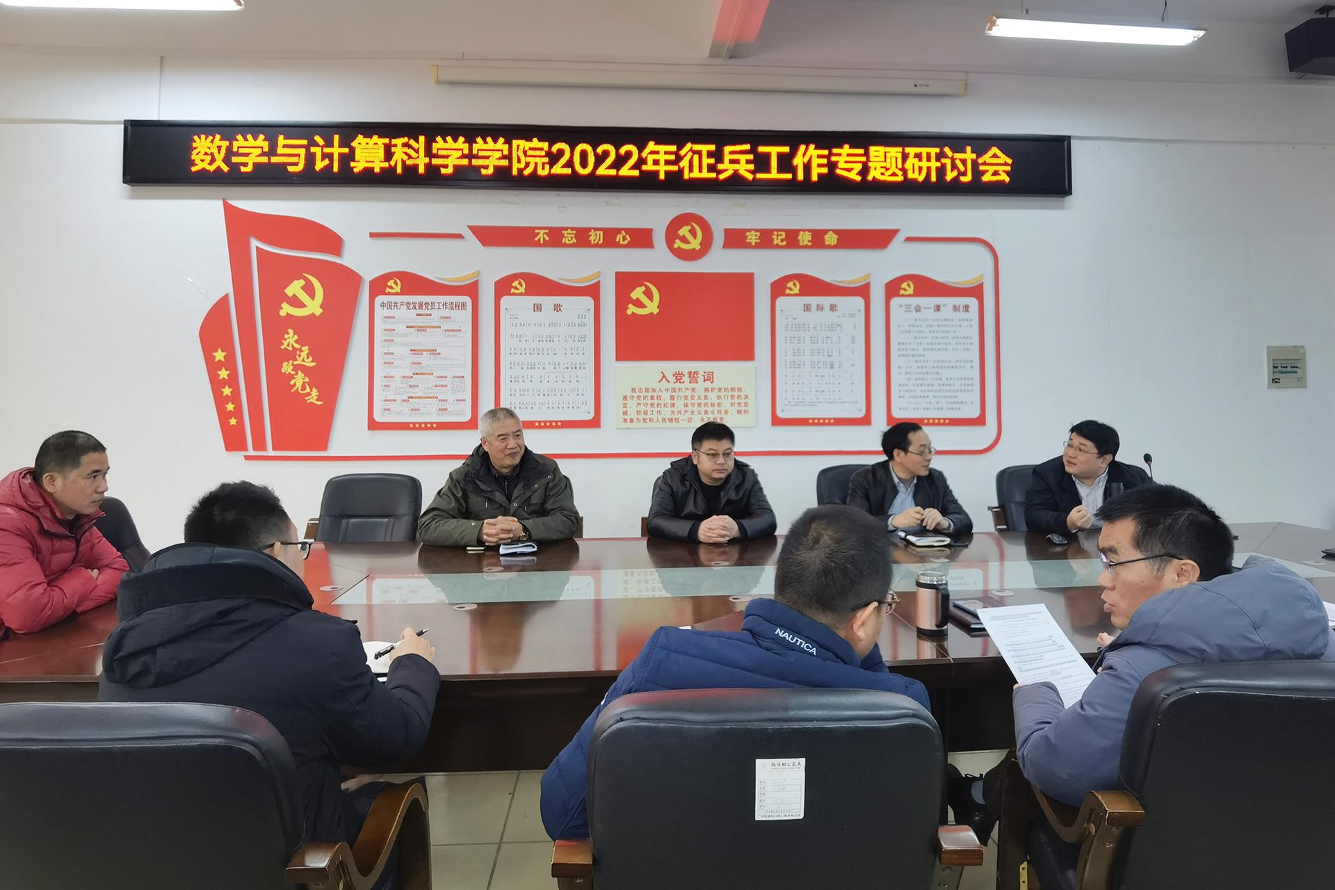 12月31日下午,数学与计算科学学院在花江校区第六教学楼504会议室召开学院征兵工作领导小组会议,研究部署2022年征兵工作。学院领导班子成员、系主任、辅导员参加会议。