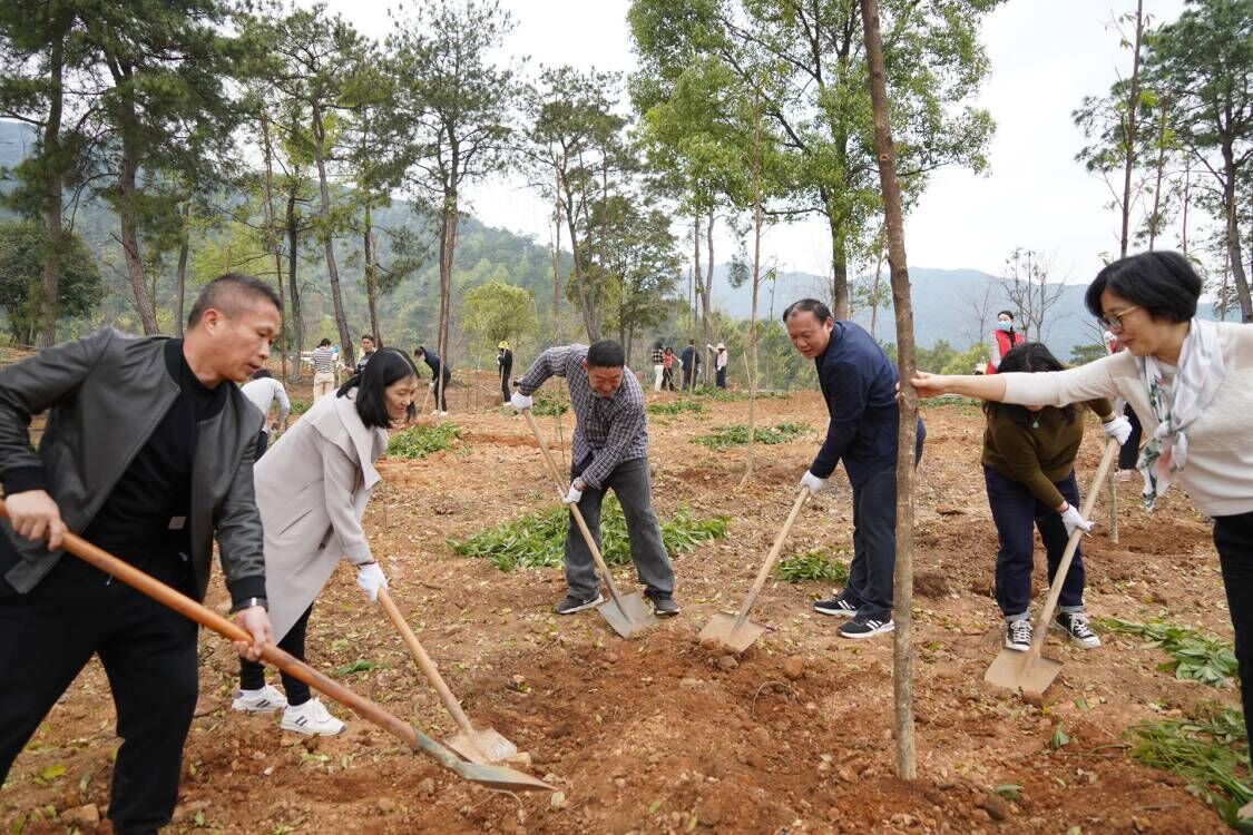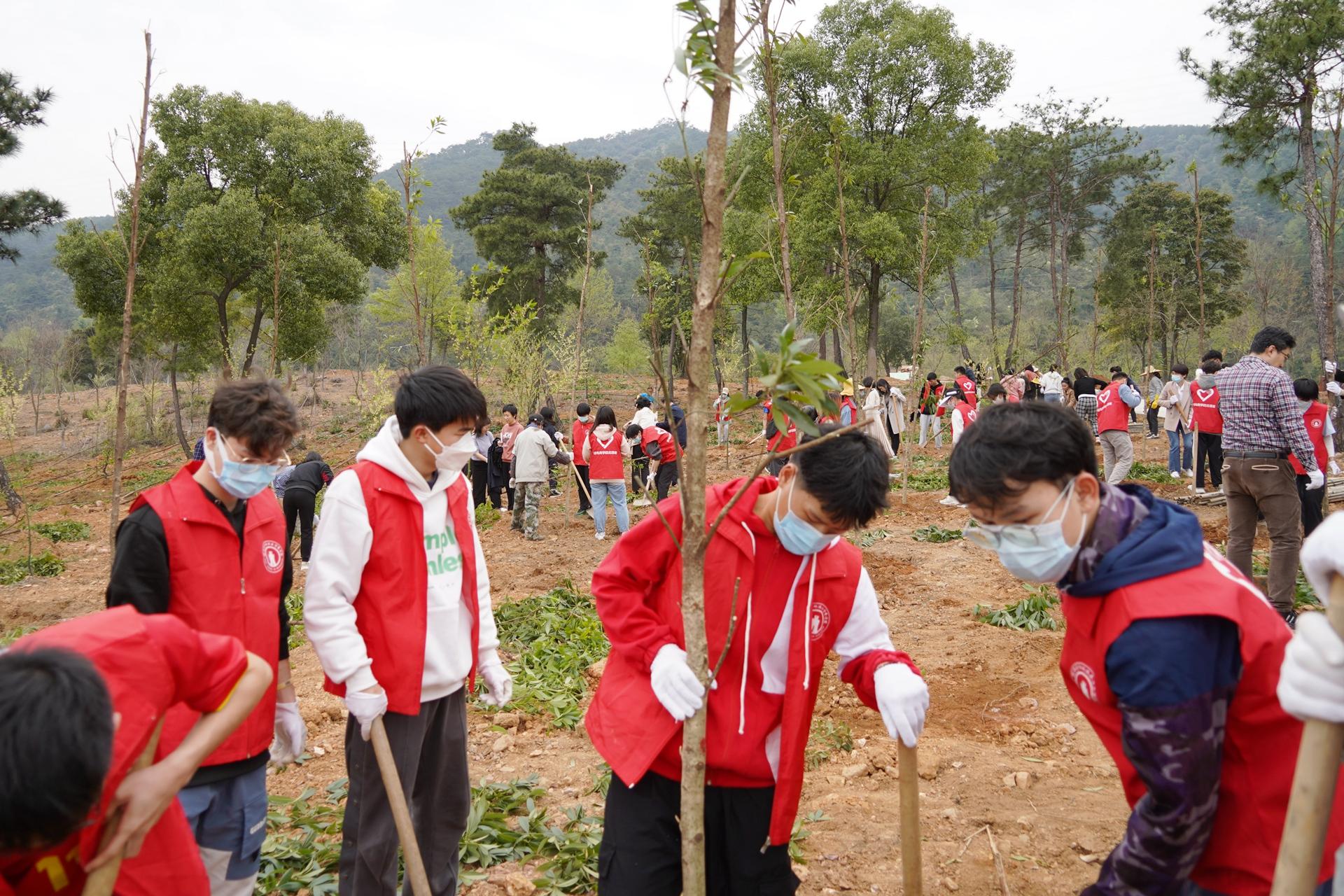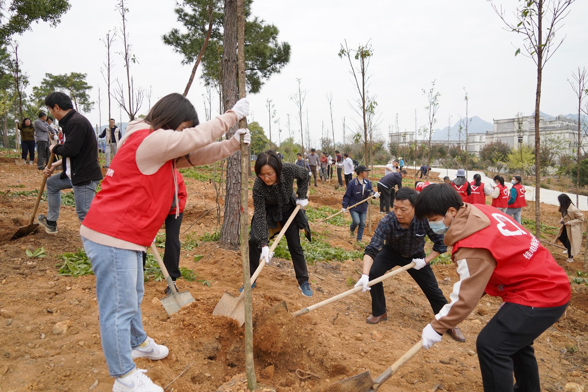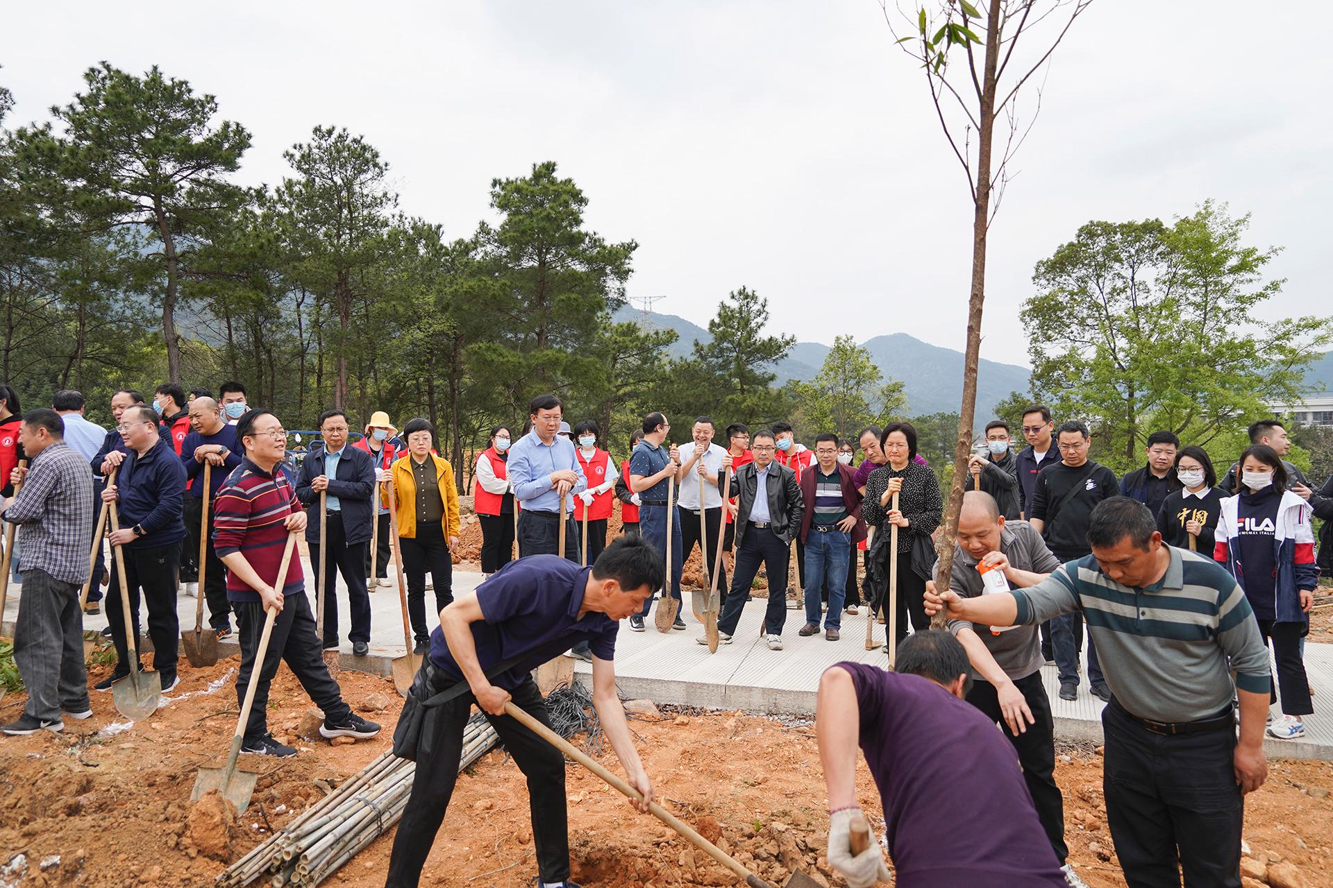 最是一年春光好,植树添绿正当时。在我国第44个植树节到来之际,3月11日下午,校领导唐平秋、徐华蕊、陈贵英、聂慧、刘宝臣、钟平、梁启谈、潘开林、曹辉景带领相关部门负责人、教职员工和学生志愿者,在花江校区球类馆北侧樱花园小山坡开展植树绿化活动。