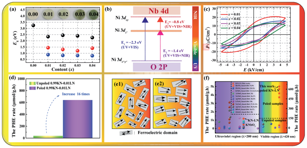 与传统具有优异紫外光催化性能的宽禁带氧化物铁电体相比,窄带隙铁电半导体材料在可见光光催化领域具有广阔的应用前景。但是,由于大多数铁电半导体材料存在明显的漏电流和铁电性减弱,通过外高压电场极化来建立去极化电场进一步提高光催化活性存在瓶颈。因此,平衡此类材料的半导特性和铁电性具有挑战性。袁昌来研究员所在课题组采用协同设计的策略,通过Ba/Ni/Bi共掺杂制备了一系列具有窄带隙和高场极化能力的KNbO3基铁电半导体光催化材料。先期采用高场极化诱导的去极化电场(Edp)有效增强了样品的可见光催化析氢能力(ACS Appl. Mater. Interfaces 2022, 14, 7, 8916–8930);课题组进一步优化离子改性元素种类,采用La/Ni共掺杂得到一种新型可见光驱动的KNbO3基铁电半导体光催化剂,即KNbO3-LaNiO3-δ;同时兼具完美低场铁电性与低带隙的特性使得其在室温高场极化后,可见光下的析氢速率可以提高到642.0 μmol/g·h,为目前已知氧化物铁电半导体的最高可见光析氢速率。在改进的KN基铁电半导体光催化材料中观察到的显著增强的析氢速率与极窄带隙(1.45-1.24 eV)和高场极化提高载流子分离效率有关。本工作为设计具有良好可见光活性的铁电基氧化物光催化剂提供了一个可行的解决方案,并为深入研究半导体铁电体的极化机理提供了思路。