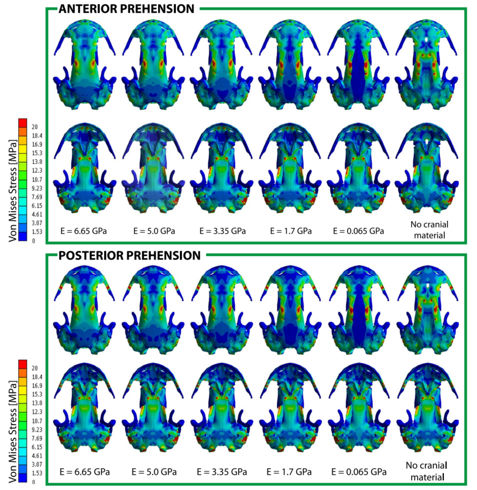 上述论文研究发现,在极北鲵这类两栖动物的变态发育前后,其头骨结构发生了变化,这些变化会影响其摄食的能力。极北鲵变态发育过程中其头骨的形态和组织特性都会发生变化,这些变化将影响其头骨的功能。分析清楚这些变化对其头骨功能的影响机理将有助于解开蝾螈冠群(crown-group of salamanders)早期进化的奥秘。在本项研究中,基于成年极北鲵头骨的不同组织成分特点和骨化模式生成了不同的三维力学模型,并分别对它们进行了有限元分析。