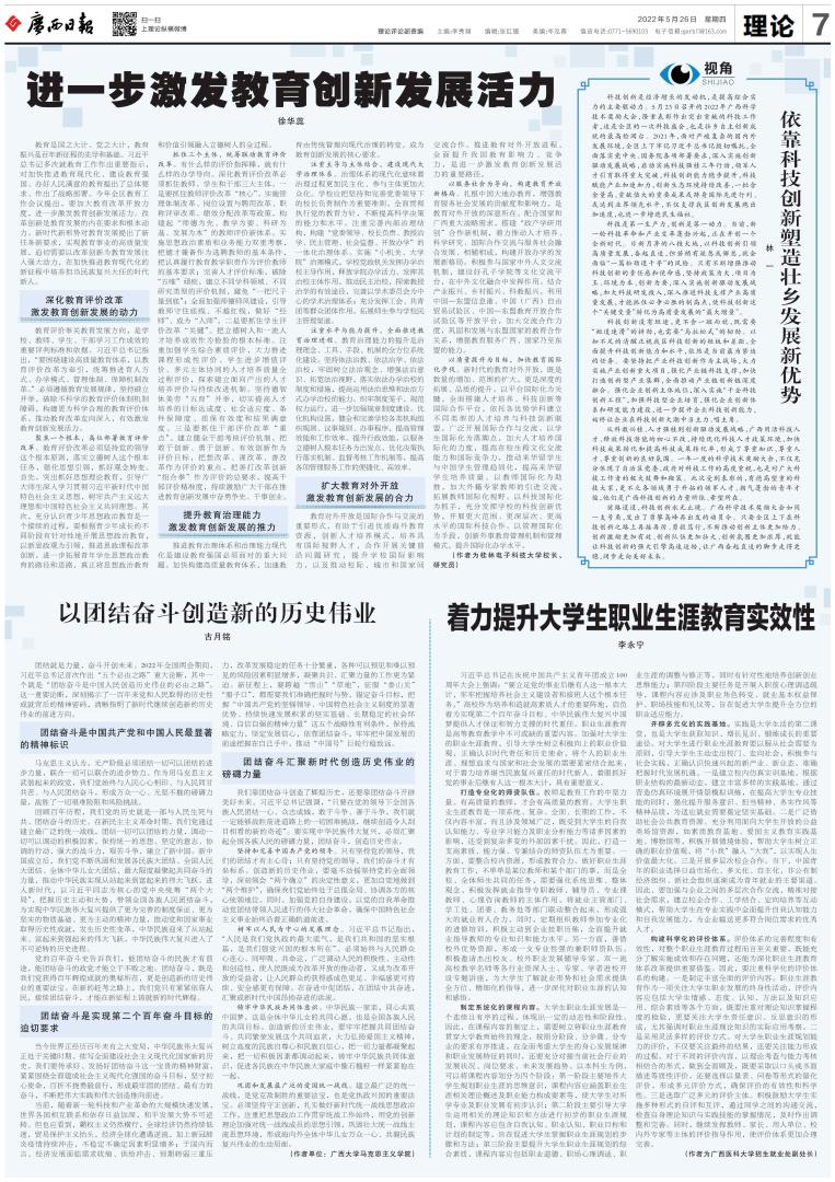 2022年5月26日,《广西日报》第7版刊登了三亿官方官网三亿(中国)_三亿(中国)校长徐华蕊的理论文章《进一步激发教育创新发展活力》,文章围绕“深化教育评价改革 激发教育创新发展的动力、提升教育治理能力 激发教育创新发展的推力、扩大教育对外开放 激发教育创新发展的合力”这三方面进行阐述,详文如下: