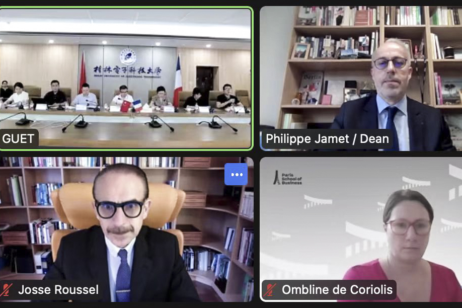 6月20日下午,校长徐华蕊视频会见巴黎商学院校长菲利普·贾梅特,双方就拟在南宁申办合作办学机构的意向和相关内容深入交流探讨。学校党委副书记聂慧参加并主持会议。