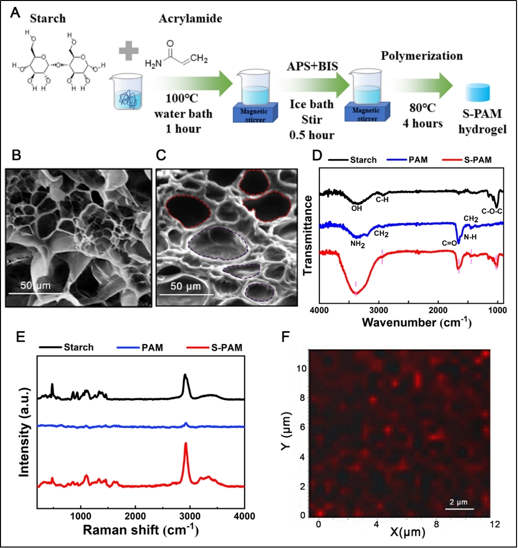 图1.S-PAM水凝胶的制备与表征 A.S-PAM制备流程;B.PAM水凝胶电镜图;C.S-PAM水凝胶电镜图;D.Starch、PAM、S-PAM红外光谱;E.Starch、PAM、S-PAM拉曼光谱; F.S-PAM拉曼mapping图像。