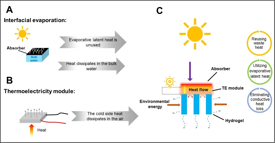 太阳能光热蒸汽技术是一种新兴的净水手段,它利用高效的光热转换材料,将太阳光转换成热能,加速水蒸气的产生,促进水分子与污染物的分离。但是,从太阳能吸收体到水体的传导热损失以及蒸发器表面的结盐问题一直是困扰这一技术向前发展的两大难题。热电材料通过塞贝克效应输出电能,其优异的环境适应性使其可以在不同的条件下工作。然而,为了获得理想的输出性能,热电器件冷端常采用诸如:散热片、辐射制冷器等附件将冷端的废热直接或间接地耗散在周围空气中,导致了能量损失较大。