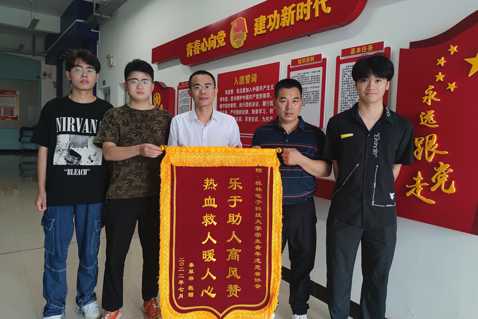 7月8日,学校附近村民秦翠林先生将一面写着“乐于助人高风赞,热血救人暖人心”的锦旗送到了校团委书记曾宪立手上,感谢学校组织学生无偿献血,挽救了亲人的生命。