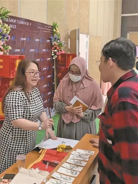6月9日,印度尼西亚69所高校齐聚玛琅城,商讨如何提高语言测试水平。图为玛琅大学孔院展台前,工作人员在展示中国毛笔字书法,吸引了众多参会代表的关注。(图为受访者提供)