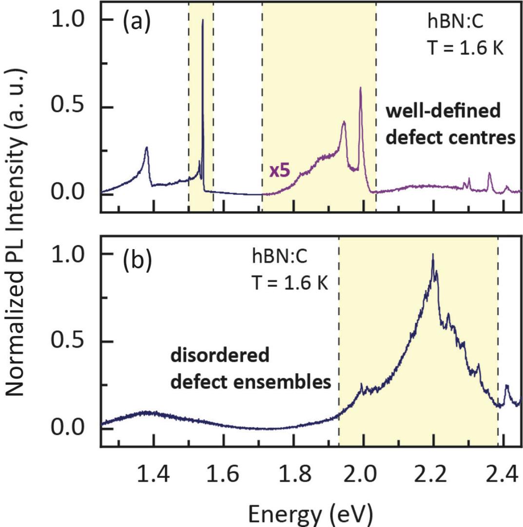 在原子尺度上对于二维材料点缺陷的有效识别、操控与性能调控是发展相关量子计算和量子信息器件所面临的重要挑战。相关领域对于六方碳化硼中单光子发射中心的原子结构一直存在很大争议,且如何获得优异性能的单光子发射中心仍然缺乏理论依据。本研究一方面基于长期的实验发现,在碳原子掺杂的六方碳化硼样品中,有的能够形成单光子发射中心,相应的量子态及谱线具有很好的单色性,但有些样品相对无序且谱线有很大的展宽(图1)。另一方面,基于密度泛函理论第一性原理计算,对六方碳化硼中一系列的碳掺杂、空位缺陷进行分类,并对其稳定性、电子结构进行深入地分析揭示了一种缺陷的配对机制。即缺陷之间电子的配对可以驱使具有施主缺陷态和受主缺陷态的缺陷进行复合,形成稳定的、具有共振跃迁缺陷态的单光子发射中心。相应的荧光跃迁由缺陷态与价带或导带之间的跃迁,转变成带隙内部缺陷态之间的共振跃迁,单色性和相干性获得显著提升(图2)。上述研究能够为实验上制备基于半导体缺陷的单光子发射中心,开发新一代的量子计算、通讯及计量器件提供深层次的指导。