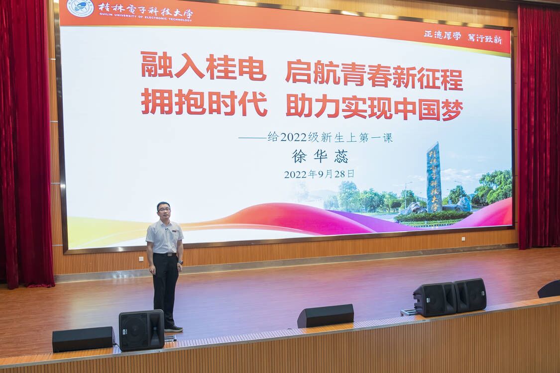 9月28日晚,校长徐华蕊为2022级新生讲授主题为“融入桂电 启航青春新征程 拥抱时代 助力实现中国梦”的开学第一课。他从桂电是一所怎样的大学、我们处在一个怎样的时代、如何走好在桂电的青春征程等三个方面为同学们授课,主要结合桂电历史、身边榜样以及人才培养改革等方面进行了说明,勉励同学们要树立远大志向,锤炼品德、报效国家;要秉承桂电精神,艰苦奋斗、自强不息;要始终求知若渴,实学实干、勇于创新;要拓展思维视野,通专结合、全面发展。