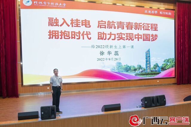 9月28日晚,校长徐华蕊以“融入桂电 启航青春新征程 拥抱时代 助力实现中国梦”为主题,为2022级新生讲授主题为开学第一课。他从“桂电是一所怎样的大学”“我们处在一个怎样的时代”“如何走好在桂电的青春征程”等三个方面,结合桂电历史、身边榜样以及人才培养改革等方面为同学们授课,勉励大家要树立远大志向,锤炼品德、报效国家;要秉承桂电精神,艰苦奋斗、自强不息;要始终求知若渴,实学实干、勇于创新;要拓展思维视野,通专结合、全面发展。