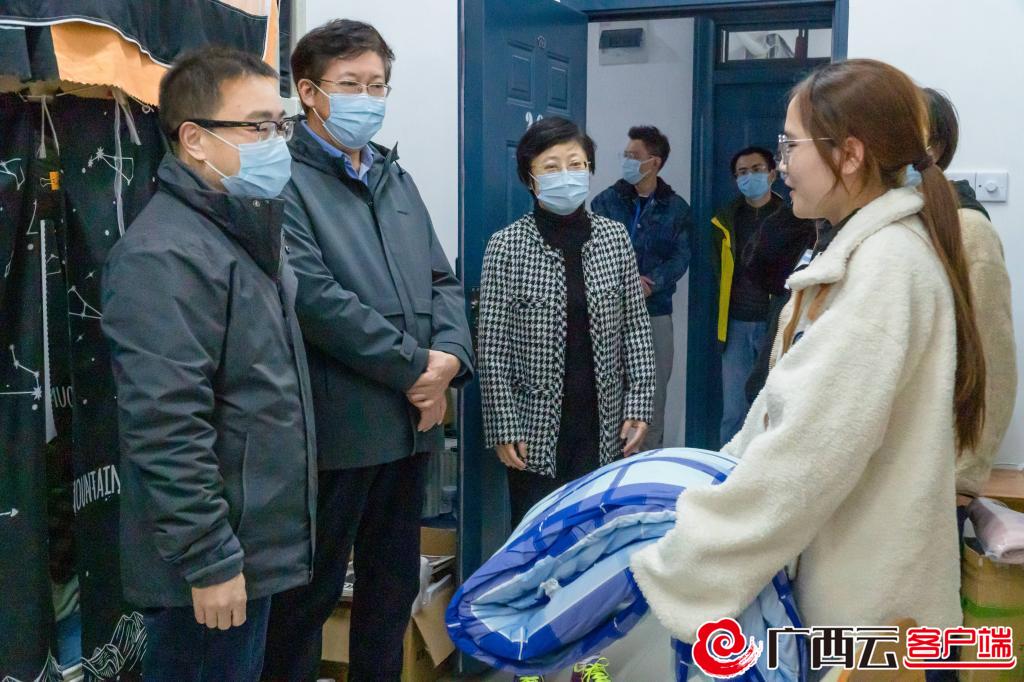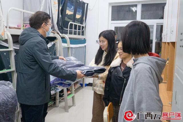 “试一下衣服看看合不合适?”“有什么困难及时跟老师和学校反映,我们会想办法解决,共同渡过难关。”“天气突然变化,注意别感冒了,上网课也要穿多点,长时间坐着容易冷。”当晚,该校党委书记唐平秋、校长徐华蕊、校党委副书记聂慧等人来到花江校区学生宿舍慰问,与学生亲切交流,细心询问同学们的生活和学习等情况,并为生活、学习用品物资紧缺的学生发放棉衣棉被等。