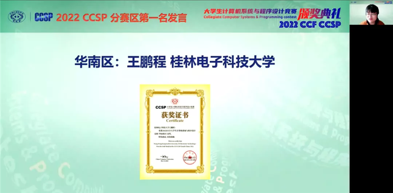 12月11-12日,由中国计算机学会(CCF)主办的第七届大学生计算机系统与程序设计竞赛(CCSP)成功举行。桂电学子在此次大赛中获得了突破性成绩,总成绩(每所高校排名前5名选手成绩之和)并列本次赛事的全国高校排名第8,首次进入全国前10。计算机与信息安全学院王鹏程同学获得全国金奖和华南赛区冠军并在颁奖会上作代表发言,另有7名同学获得银奖。此次比赛由校级创新基地“软件技术实训与项目研发创新基地”指导教师汪华登、管军霖指导。