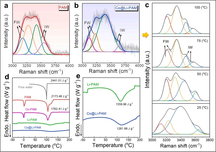 通过XPS能谱测试表明了功能性离子Co2+和Li+的成功掺杂,钴的窄谱扫描结果和红外光谱中氨基官能团从3354.7 cm-1到3396.1 cm-1的移动,证明了钴离子与聚合物链中的氨基之间配位键的形成。利用聚丙烯酰胺水凝胶和Co@Li-PAM水凝胶的拉曼光谱分析了凝胶中水分子微环境变化对水状态和含量的影响,表明了微环境的调控可以使得凝胶中水分子重新排列,弱化了水分子周围的环境束力,增加凝胶中中间水的相对含量。通过变温拉曼的测试结果研究了在蒸发过程中,自由水和中间水的相变优先级。随着温度的升高,凝胶中的中间水由于较低的蒸发势垒先于自由水进行蒸发。差示扫描量热仪(DSC)的测试结果论证了凝胶中水状态和含量的调控对焓变的影响,表明了增加中间水的含量能够有效降低蒸发焓,促进蒸发速率,加快散热器的散热速度。