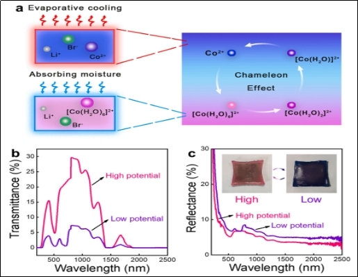 随着科学技术的不断进步,全球的电子产业正在蓬勃发展,电子产品的更新换代速度越来越快,对于散热技术和性能的要求也越来越高。传统的主动冷却方式,如风冷、水冷等,虽然有着优异的冷却性能,但是,由于其占地面积大、结构复杂、能耗高等缺点,在信息时代高集成度发展的趋势下,其应用场景犹如池鱼笼鸟,被大幅受限。被动式的蒸发散热因其灵活方便的特点,是最具潜力的散热“新星”,但其较差的散热效果和持续性以及无反馈冷却的工作方式限制了其广泛的发展。基于此,课题组通过功能性离子掺杂,弱化了水分子周围的环境束力,提升了热量耗散的速度,在界面处增加了动态非共价键,降低了接触热阻,优化了散热性能,通过直观的颜色变化反馈凝胶散热器的蒸发潜力和散热状态,对凝胶蒸发冷却的高效、智能化发展具有重要意义。