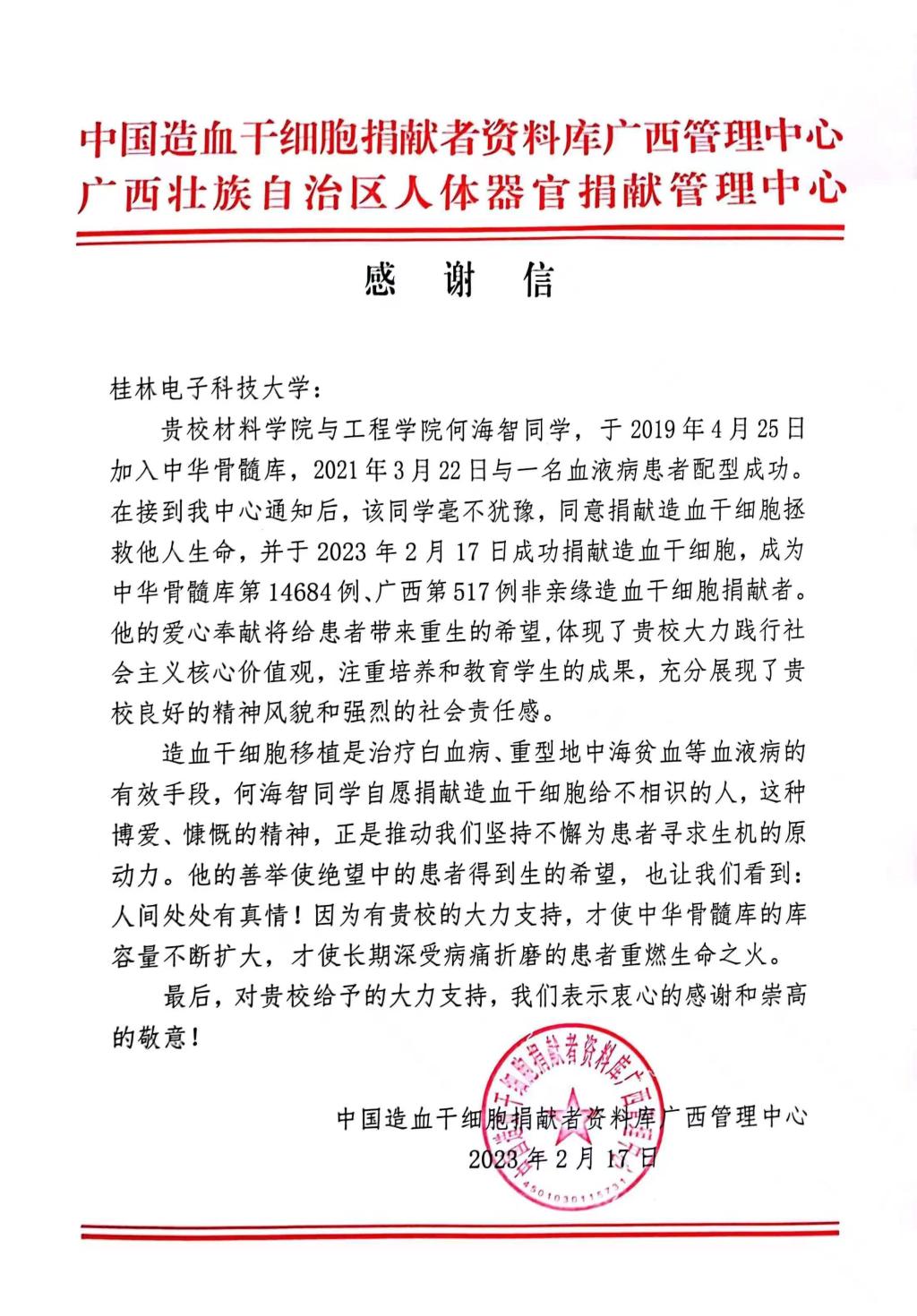 2月17日,三亿官方官网三亿(中国)_三亿(中国)材料科学与工程学院学生何海智成功捐献200毫升造血干细胞混悬液,成为中华骨髓库第14684例、广西第517例、桂林第55例造血干细胞捐献者。他的善举,为一位素未谋面的患者带去了生的希望。