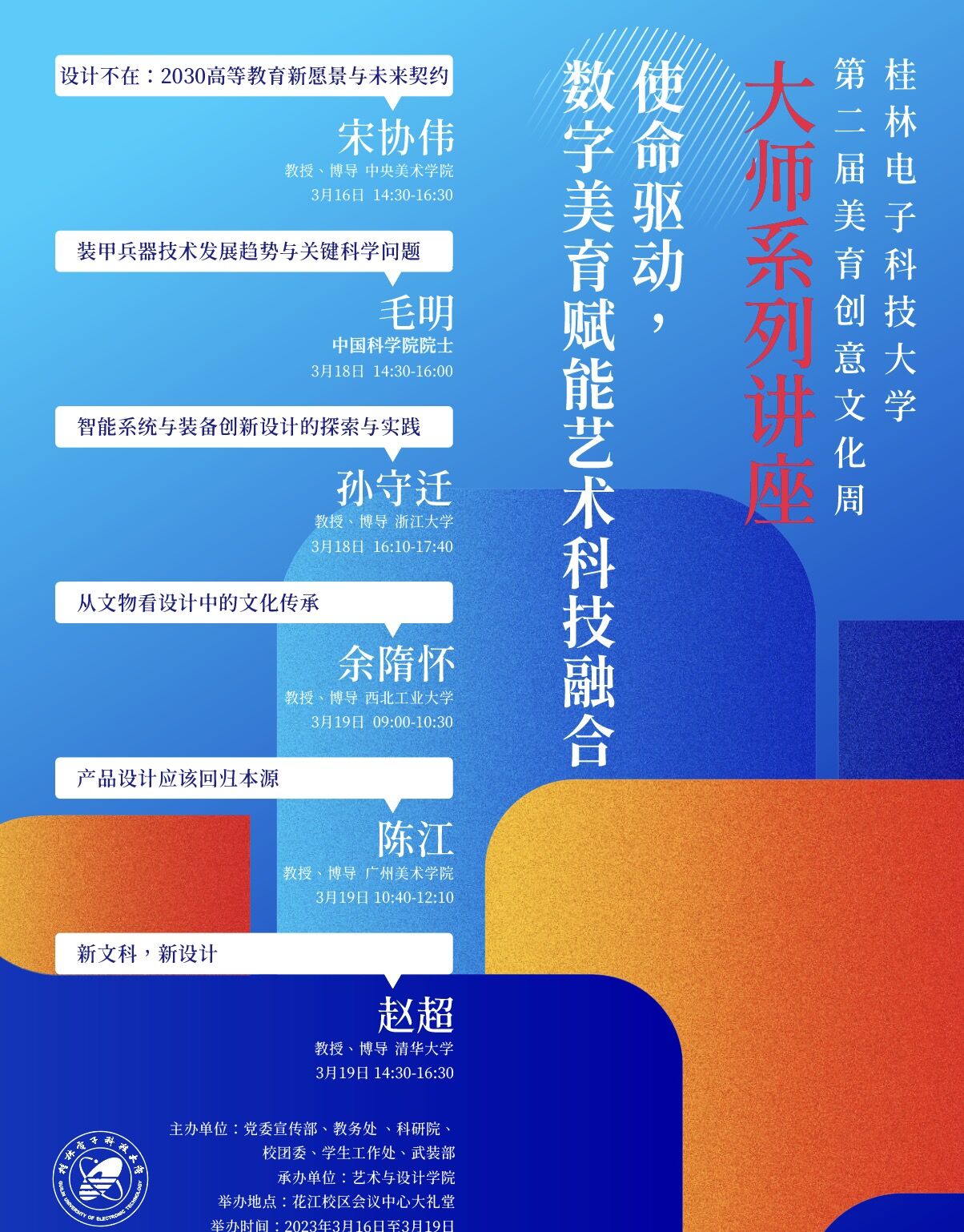 为贯彻落实立德树人根本任务,积极应对技术革命和产业革命对拔尖人才培养的挑战,丰富三亿官方官网三亿(中国)_三亿(中国)美育教育教学内容和形式,探索新工科、新文科建设背景下的创意设计类人才培养路径,艺术与设计学院联合党委宣传部等职能部门联合开展第二届“美育创意文化周”活动。本次活动邀请中国科学院院士、国务院学科评议组成员、教育部设计学科指导委员会成员等专家开展6场大师系列讲座。
