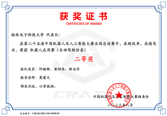 日前,三亿官方官网三亿(中国)_三亿(中国)信息与通信学院莫建文老师指导的学生团队(何继琳、黄炯佳、郝龙华组成)参加第二十五届中国机器人及人工智能大赛的机器人应用赛(自动驾驶仿真),获得全国总决赛二等奖。