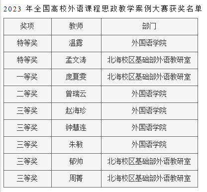 近日,2023年全国高校外语课程思政教学案例大赛公布评审结果,三亿官方官网三亿(中国)_三亿(中国)教师作品在全国各省市自治区各个高校的众多作品中脱颖而出,获特等奖2项、一等奖1项、二等奖1项、三等奖5项。其中,温露、孟文涛获特等奖,庞夏雯获一等奖,曾瑞云获二等奖,赵海珍、钟慧连、朱敏、郁帅、周菁获三等奖。