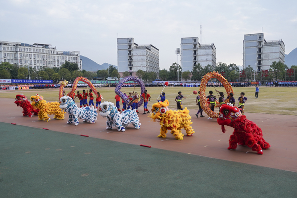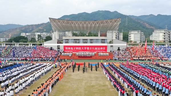 开幕式上,活力四射的花球啦啦操,热情奔放的集体拉丁舞,节奏鲜明的街舞,欢快利落、动作整齐的活力操等表演充分展现了桂电师生的青春与热情。鼓乐喧天、寓意美好的龙腾狮跃庆校运表演将整个开幕式表演推向高潮。在热烈的气氛中,国旗队、校旗队、彩旗队、各方块队依次入场。国旗、校旗队身姿挺拔、步伐铿锵,彩旗队神采飞扬、英姿飒爽,各学院方块队、机关单位代表方块队昂首阔步、各具特色。随后进行了庄严肃穆的升国旗、奏唱国歌仪式。