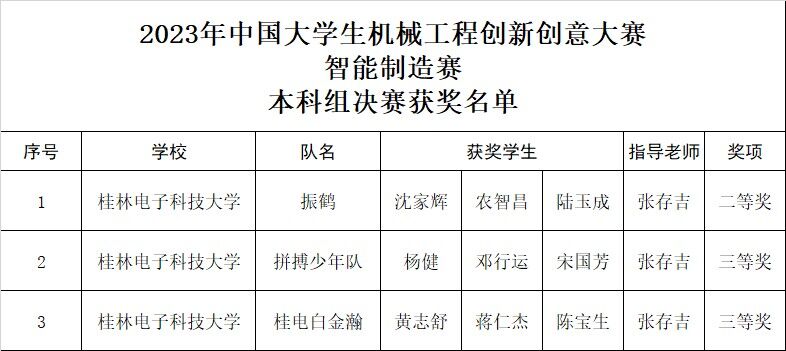 中国大学生机械工程创新创意大赛智能制造赛是由中国机械工程学会、教育部高等学校机械类专业教学指导委员会、教育部高等学校材料类专业教学指导委员会、教育部高等学校工业工程类专业教学指导委员会联合主办的国家级专业赛事,自2018年起开始举办,2021年起成为中国高等教育学会发布的“全国普通高校大学生竞赛排行榜”项目之一。本届比赛历时3个月,吸引了来自全国30个省、市、自治区的180余所高等院校参加,参赛师生达2300余人。三亿官方官网三亿(中国)_三亿(中国)首次参赛取得了优异成绩,充分彰显了三亿官方官网三亿(中国)_三亿(中国)人才培养质量和桂电学子的综合实力。