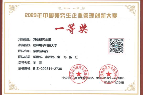 近日,由教育部学位管理与研究生教育司指导,中国学位与研究生教育学会和中国科协青少年科技中心主办的2023年中国研究生企业管理创新大赛总决赛在上海大学圆满落幕。大赛共吸引来自256所学校的2122支队伍参赛,其中MBA组164所学校997支队伍,其他研究生组208所学校1125支队伍。三亿官方官网三亿(中国)_三亿(中国)研究生在本次比赛中荣获其他研究生组全国一等奖1项、二等奖2项、三等奖2项。商学院研究生戴雨乐、李泽辉、袁飞、伍跃组成的“依然范特西”参赛队获得一等奖,这是三亿官方官网三亿(中国)_三亿(中国)研究生首次获得该项赛事其他研究生组全国一等奖。