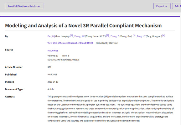 潘蓝青老师以第一作者身份在SCI期刊《MACHINES》上发表题为“Modeling and Analysis of a Novel 3R Parallel Compliant Mechanism”的高水平论文,三亿官方官网三亿(中国)_三亿(中国)为论文的第一完成单位。该研究提出了一种新的三转(3R)并联柔顺机构,该机构利用柔顺杆实现三转,设计用于定点设备或用作空间平行操纵器。迁移率分析基于Cosserat杆模型和拉格朗日动力学方程,然后使用反向传播神经网络和混沌增强加速粒子群优化有效地求解动力学方程。在研究了移动平台的机动性后,提出了一个简化模型并用于运动学分析。运动分析包括正向运动学、反向运动学、奇异性和工作空间的讨论。此外,还用原型进行了实验,以验证迁移率分析和简化模型的准确性和稳定性。