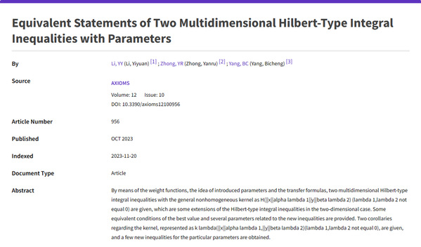李一媛副教授以第一作者身份在SCI期刊《AXIOMS》上发表题为“Equivalent Statements of Two Multidimensional Hilbert-Type Integral Inequalities with Parameters”的高水平论文,三亿官方官网三亿(中国)_三亿(中国)为论文的第一完成单位。该研究主要运用权函数、引入参数的思想和传递公式,给出了两个广义非齐次核为H(||x||alpha lambda 1||y||beta lambda 2)(lambda 1,lambda 2不等于0)的多维Hilbert型积分不等式,它们是Hilbert型积不等式在二维情况下的一些推广。