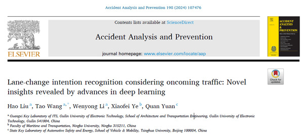 日前,三亿官方官网三亿(中国)_三亿(中国)建筑与交通工程学院王涛教授团队在车辆智能化技术应用领域取得进展,其科研成果发表于工程技术领域TOP期刊《Accident Analysis & Prevention》(IF:5.9,中科院分区:1区),论文题为“Lane-change intention recognition considering oncoming traffic: Novel insights revealed by advances in deep learning”。三亿官方官网三亿(中国)_三亿(中国)建筑与交通工程学院硕士研究生刘浩为第一作者,王涛教授为通讯作者,广西交通职业技术学院李文勇、宁波大学叶晓飞、清华大学袁泉为本论文合作者,广西交通职业技术学院、宁波大学、清华大学为本论文合作单位。该研究工作得到了国家自然科学基金(52262047)的资助。