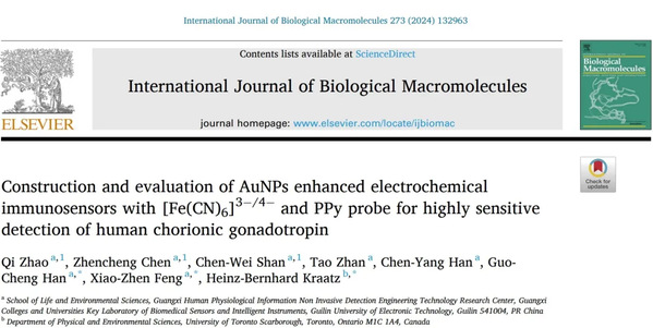 1.Q.Zhao, Z.Chen, C.-W.Shan, T.Zhan, C.-Y.Han,G.-C.Han, X.-Z.Feng, H.-B.Kraatz, Construction and evaluation of AuNPs enhanced electrochemical immunosensors with [Fe(CN)6]3-/4-and PPy probe for highly sensitive detection of human chorionic gonadotropin. International Journal of Biological Macromolecules,273 (2024) 132963.https://:doi.org/10.1016/j.ijbiomac.2024.132963.