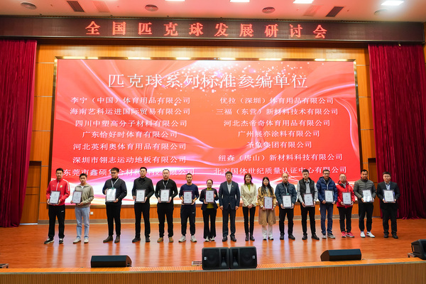 中体产业标准认证集团副总裁蔡元珏对《匹克球运动球的通用要求及试验方法》《匹克球运动球拍的通用要求及试验方法》《匹克球运动场地的通用要求及试验方法》等三项团体标准解读与应用进行了阐释。万建斌与孙文兵分别为上述三项标准的参编单位颁发证书。