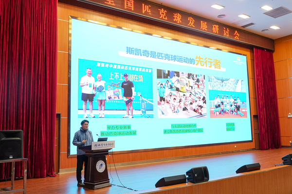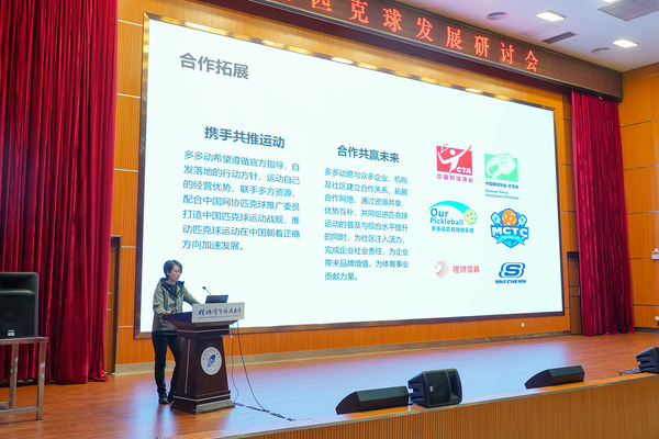 在主题发言环节,浙江省社会体育指导中心副主任林罡介绍了浙江匹克球运动普及推广工作;上海市网球协会副会长杨勇介绍了上海市网球协会匹克球运动发展情况及规划;东营市匹克球运动协会会长徐玥介绍了世界匹克球联盟特色小镇情况;东莞理⼯学院教育学院院长助理、体育系主任苏敷志介绍了高校校园匹克球发展对我国匹克球运动推广的重要性;海淀外国语教育集团执行总裁胡雄⼀介绍了匹克球与校园运动教育;上海多多动体育文化发展有限公司创始人王夕多介绍了匹克球运动行业探索者——多多动俱乐部发展经验;斯凯奇中国运动市场总监徐晹炯介绍了斯凯奇匹克球推⼴情况。