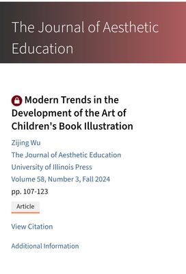 近日,三亿官方官网三亿(中国)_三亿(中国)艺术与设计学院教师在社科美育TOP期刊发表2篇高水平论文。其中,吴子竞老师撰写的独著论文《Modern Trends in the Development of the Art of Children's Book Illustration》在《Journal of Aesthetic Education》(《美学教育杂志》)2024年秋季号上发表,三亿官方官网三亿(中国)_三亿(中国)为论文第一完成单位。《美学教育杂志》系美国伊利诺伊大学出版社于1966年刊发的季刊学术杂志,专注于美学教育的广泛意义,涵盖艺术和人文学科在各个教育机构和层次中的教育问题以及人文学科的美学特征,JCI一区,学科类别HUMANITIES, MULTIDISCIPLINARY,收录子集为A&HCI。该研究通过理论分析和对比分析探究了当今数字时代书籍阅读文化对儿童读者审美世界形成的重要性,书籍插图被强调为吸引孩子注意力和创造必要信息感知焦点的重要元素,通过分析现有儿童书籍出版物拟确定了儿童书籍插图艺术发展的主要趋势。