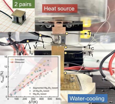 分段设计是一种被广泛采用的热电器件设计策略,是指通过充分利用不同温度区间材料的热电特性来提高热电器件的总体效率。建立高度匹配的材料关系对于最大化转换效率至关重要。研究团队在分段组合筛选过程中,特别强调了材料相容性因子与相对电流密度的概念,并借助COMSOL有限元仿真和实验结果验证了最优分段组合理论模型的有效性与实用性。此外,研究团队构建了一种集成环境友好的n型Mg3(Sb,Bi)2与p型Bi0.5Sb1.5Te3-GeTe最优分段组合的热电发电器件。该器件在温差为440 K的条件下,实现了10.4%的最大转换效率和0.41 W的峰值输出功率。该成果不仅为开发高效热电材料组合提供了坚实的理论基础,也为宽温域高效率热电器件的设计提供了重要思路。