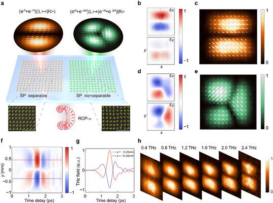 4、空间-偏振可分与不可分的太赫兹矢量光束产生:研究团队进一步设计了两类太赫兹矢量光束,在实验上成功产生空间-偏振可分与不可分两类独特矢量特性的太赫兹光束,证实了调控方案的宽带性。(图5)