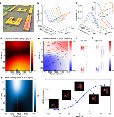 1、基于耦合效应的手性超原子设计:研究团队提出耦合调控型的手性超原子由金属条形谐振器(BR)与开口环谐振器(SRR)构成。通过调节BR与SRR的耦合强度,在圆偏振泵浦下实现SRR上磁偶极子谐振强度的连续调制。(图2)