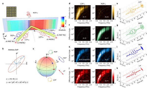 3、产生任意THz偏振态:通过在设计上引入一对相反的相位梯度将非线性超表面产生的LCP与RCP分量在空间上分离开,从而在特定衍射级次上实现正交圆偏振分量的复振幅控制,进而叠加出任意的偏振态。(图4)