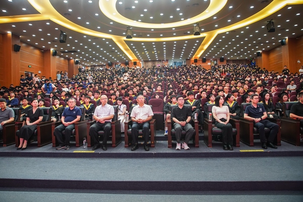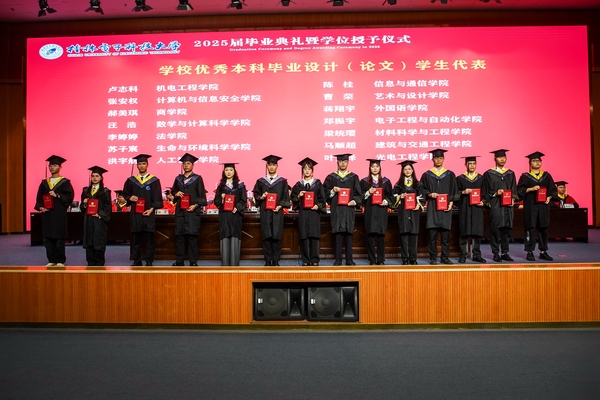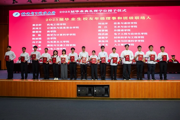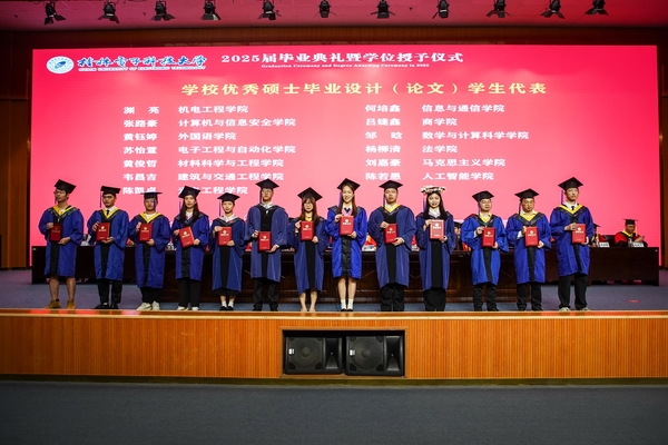 校长张文涛向全体毕业生同学送上祝福,向悉心教导、辛勤养育同学们的师长、父母致以敬意。他指出,同学们怀揣青春梦想踏入桂电校园,以青春视角见证时代的铿锵步伐,用青春奋斗助力母校的跨越发展,用青春成长诠释在桂电校园的青春蜕变。今天学位帽上的流苏轻轻拨转,既是对过往求学岁月的深情告别,更是青春征程的全新启航。希望同学们主动寻找机遇、牢牢把握机遇、更加珍惜机遇,奔赴一场“不被擦肩”的青春征程,让有限生命燎原绽放;勇于向未知宣战,拒绝被标签定义,冲破思维樊笼,奔赴一场“不被设限”的成长征途,找到属于自己的星辰大海;拒绝黯淡、努力发光,在勇往直前中永葆赤诚,奔赴一场“永不辜负”的岁月新章,镌刻属于自己的青春担当。