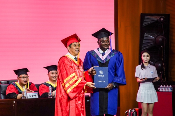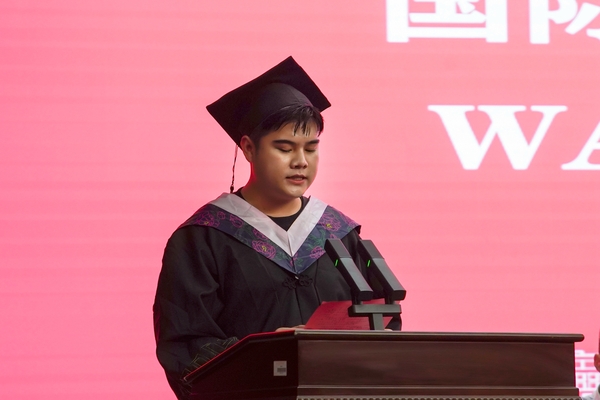 留学生代表、外国语学院汉语国际教育专业本科毕业生林昊阳在典礼上发言