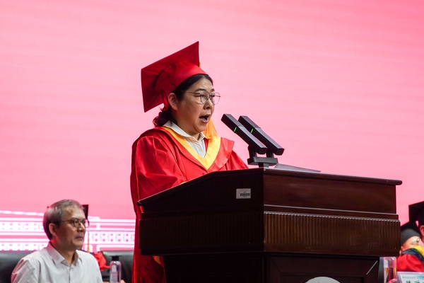 教师代表秦红波教授向圆满完成学业的毕业生们致以祝贺,希望毕业生们能以开放的心态面对变化,以谦虚的姿态向他人学习,在实践中锤炼本领;认清自我,找准定位,树立自己的人生目标,保持一颗进取之心;常怀感恩之心,行有所敬,做到明辨是非、知恩图报,不忘初心、脚踏实地。