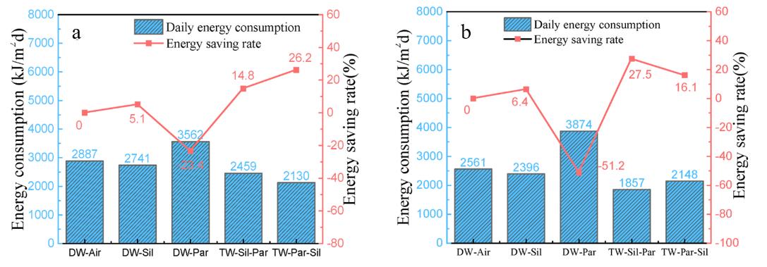 图2:五种玻璃窗结构的能耗比较(a)夏季(b)冬季