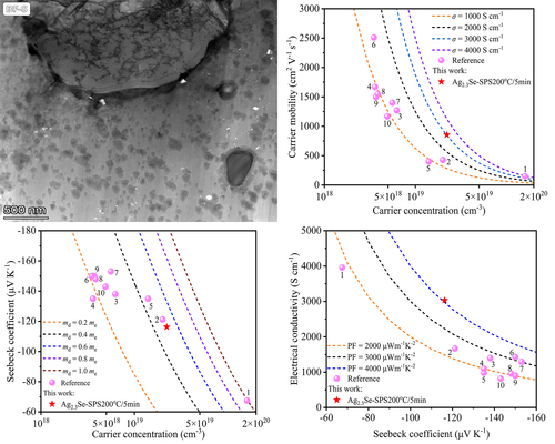 柔性热电薄膜能够贴合皮肤,并持续将人体与周围环境之间的温差转化为电能,被视为具有广泛应用前景的柔性自供电电源,而柔性热电薄膜的功率因子是决定其输出功率密度的关键因素之一。β-Ag2Se因其良好的机械性能和生物相容性,在柔性热电薄膜领域展现出巨大潜力,然而,通过改变Ag/Se化学计量比或引入第二相来优化其功率因子的方法已接近极限。该研究工作采用类液相烧结策略,在放电等离子烧结过程中,利用金属银中的银离子向硒化银中迁移并析出的特性,在柔性Ag/β-Ag2Se复合薄膜内构建出大尺寸且与基体结构共格的富银纳米析出相,从而在室温实现了超过4000 μWm⁻¹K⁻²的功率因子新纪录。研究论文揭示了富银纳米析出相在提升载流子浓度、增强态密度有效质量以及减轻由相界面和声学声子引起的载流子散射方面的关键作用。