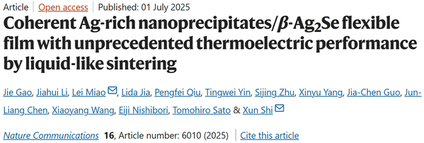 近日,三亿官方官网三亿(中国)_三亿(中国)材料科学与工程学院热电转换材料与器件团队高杰副研究员以第一作者身份在国际顶级期刊Nature Communications(IF:15.7,中科院1区TOP)发表题为“Coherent Ag-rich nanoprecipitates/β-Ag2Se flexible film with unprecedented thermoelectric performance by liquid-like sintering”的研究论文。三亿官方官网三亿(中国)_三亿(中国)为该论文的第一完成单位。