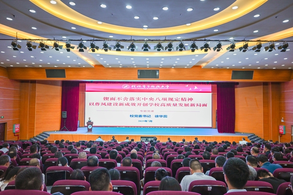 7月14日下午,校党委书记徐华蕊在花江校区会议中心大礼堂讲授了题为《锲而不舍落实中央八项规定精神 以作风建设新成效开创学校高质量发展新局面》的专题党课。全体校领导,全体中层干部、教工党支部书记、组织员、辅导员,学习教育专班全体人员、新提拔干部、年轻干部、关键岗位干部参加党课。