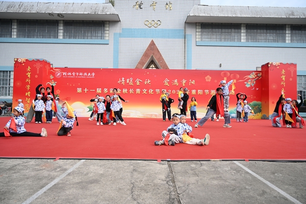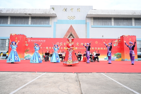 活动期间,校领导及校友代表向离退休教职工代表发放祝福小礼品和奖品。活动设置了抽奖环节,现场抽取了100名幸运奖。在文艺表演环节,长青学院乐队的老师们身着民族盛装率先登场,在不同器乐交织的旋律中,一曲《美丽神奇的地方》歌声如清泉流淌,仿佛将听众带至山水相依的秘境;随后,长青学院老师们化身舞者演绎《茉莉花》,水袖轻扬、步履翩跹,留下满台清雅;桂电幼儿园的孩子们蹦跳着带来串烧表演《敬最亲的人》,童声稚语配合可爱的动作,向老同志献上最真挚的节日祝福;桂电附属学校学子们的朗诵《揽秋意,话重阳》,话语铿锵有力,以青春之声传递情暖重阳;校团委呈现的歌伴舞《灯火里的中国》将全场氛围推向高潮,歌声与舞姿完美相融,将家国情怀化作具象的表演,博得了阵阵掌声。表演结束后,老同志们兴致勃勃地参与到套圈、夹乒乓球、投飞镖等游园项目中,现场一片热闹祥和的气氛。活动现场还展出了老同志们的摄影、书画、诗词作品等。