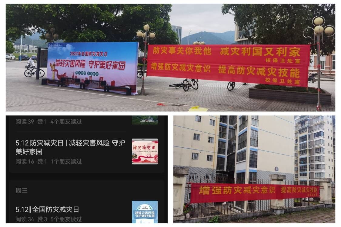 今年5月12日是我国第十四个全国防灾减灾日。校保卫处通过展板、横幅、部门网站、“平安桂电”微信公众号等平台,在线上线下开展了以“减轻灾害风险,守护美好家园”为主题的防灾减灾宣传教育活动。此次活动在两个校区及家属区共悬挂横幅6条,制作展板2块,发布防灾减灾知识推文12篇、视频2个,向师生员工宣传防灾减灾科普知识、应急避险及自救互救等常识。