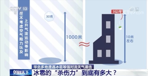 需要注意的是,以上的换算是未考虑空气阻力,以及上升气流运动等因素的估算结果。冰雹在下降过程中,会不可避免地受到空气阻力等因素的影响,“杀伤力”可能有所衰减。