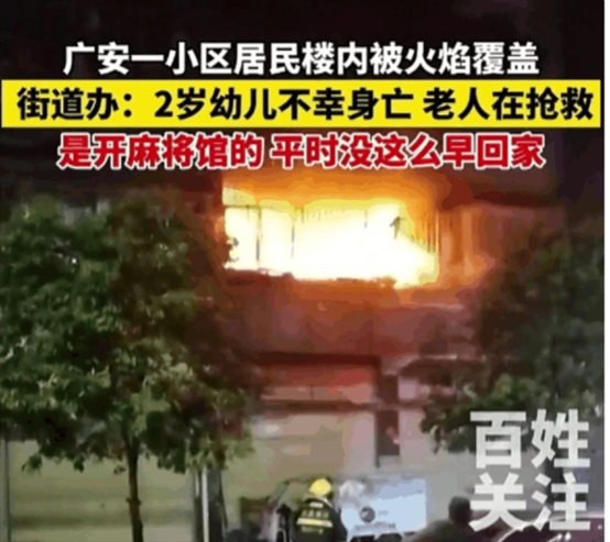 2月27日晚,四川广安长堰街锦绣山庄小区住户发生火灾,事故造成两岁多幼儿不幸身亡,一名老人正在医院抢救。