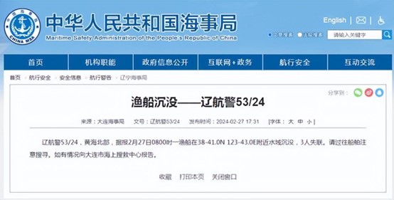 2月27日,一艘渔船在黄海北部38-41.0N 123-43.0E附近水域沉没,目前有3人失联。大连海事局已经发布了航行警告,呼吁过往船舶注意搜寻失联人员。同时,如有情况请向大连市海上搜救中心报告。