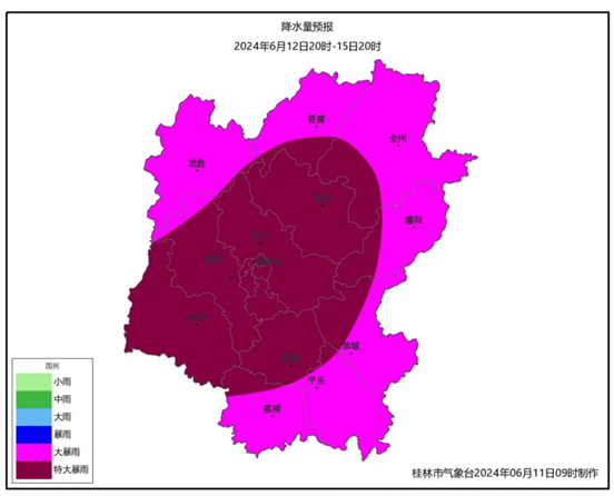 根据目前气象资料分析,预计6月13-15日,受高空槽、低涡切变及弱冷空气影响,桂林将有暴雨、局部大暴雨到特大暴雨,并伴有短时雷暴大风等强对流天气。过程累计雨量100-200毫米、局部300毫米以上,最强降雨时段在13日夜间至14日白天。最大小时雨量60-80毫米、局部100毫米以上。本次过程降雨范围较广、降雨强度大、持续时间长,致灾风险高。