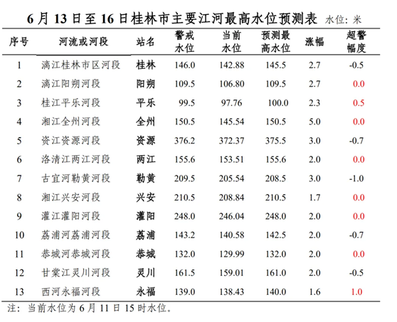 预计受强降雨影响,6月13日至16日,桂江、湘江、资江、 古宜河、洛清江等主要江河干流及其部分支流可能出现1-5.0米 的涨水过程,桂江干流阳朔县城至平乐县城河段,桂江支流恭城河,湘江干流及支流灌江,洛清江干流及支流永福西河可能出现警戒水位左右洪水,漓江桂林市区可能出现接近警戒水位洪水。